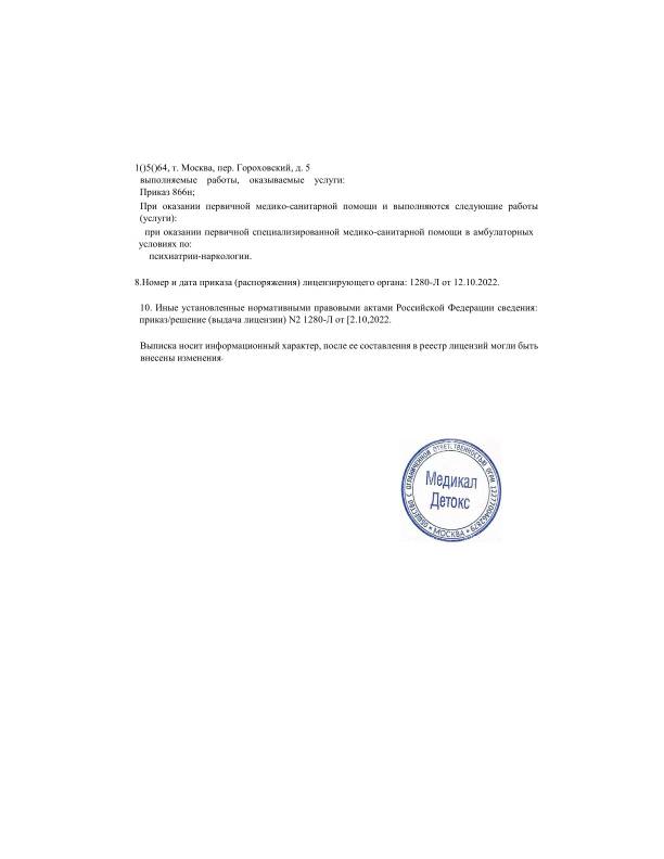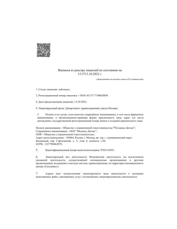 ООО «Медикал Детокс» ЛО41-01137-77/00620856 Москва пер. Гороховский д. 5, ОГРН 1147746027417